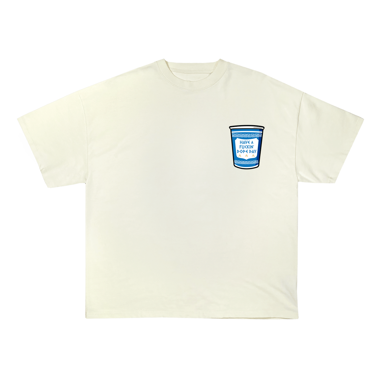 Premium cotton t-shirt w/ Classic Greek coffee cup design over left chest front and large designed crest on back